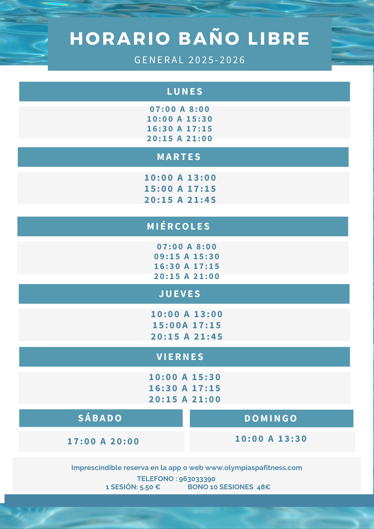 En nuestra piscina en Alboraya, con nuestras sesiones de baño libre, nada como y cuando quieras, con un amplio horario, perfecto para los que buscan flexibilidad en su horario de entrenamiento.